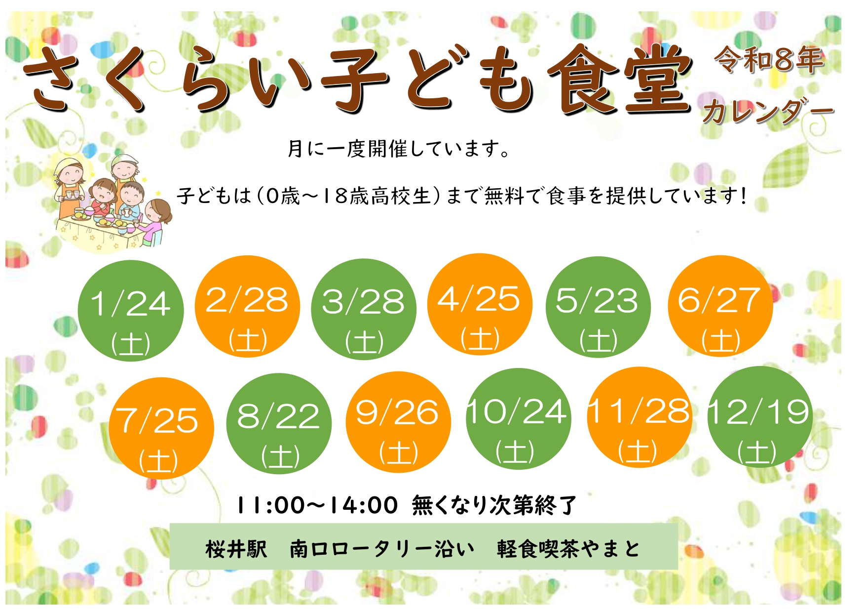 おなかがすいたら、誰かとごはんを食べたくなったら、さくらいこども食堂に来て一緒にたべましょう!